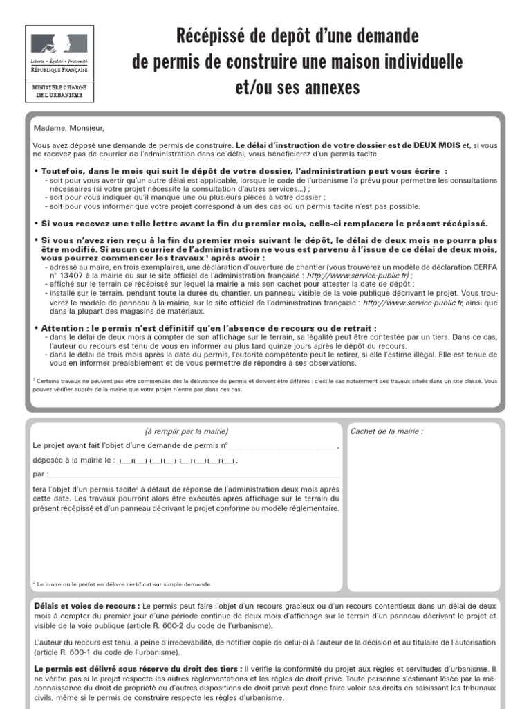 Demande de permis de construire pour une maison individuelle etou ses annexes pcmi cerfa n 1340607 ministère chargé de lurbanisme. Le cadre réservé à la mairie du lieu de projet. A formulaires cerfa n1370205 déclaration préalable lotissements et autres divisions foncières non soumis à permis daménager cerfa n1370307 déclaration préalable constructions et travaux non soumis à permis de construire portant sur une maison individuelle etou ses annexes cerfa n1340407 déclaration préalable construction travaux installations et. Identité du demandeur ou des demandeurs. Vous devez le déposer en un seul exemplaire à la mairie vous pouvez également lenvoyer par courrier par le biais dun recommandé avec accusé de réception. Il est impossible de commencer un gros chantier sans avoir obtenu un permis de construire de la part de la mairie.