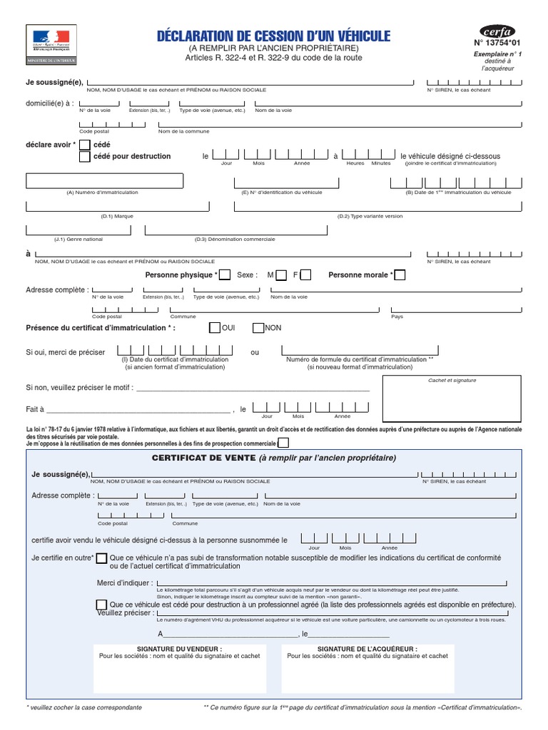 Le portail officiel du ministère de lintérieur consacré aux démarches administratives. Formulaire cerfa 13754 déclaration de cession dun véhicule à remplir par lancien propriétaire.