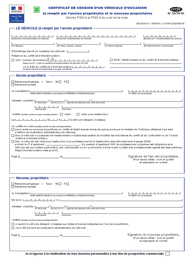 Certificat de vente voiture occasion. Pour sceller la vente dune voiture doccasion ou de tout autre véhicule ayant une carte grise quad caravane scooter etc le vendeur et lacheteur doivent remplir et signer un certificat de cession dun véhicule doccasion cerfa n1577601. Lors de la cession vendeur et acquéreur devront remplir le document cerfa n 1577601 certificat de cession dun véhicule doccasion. Carte grise immatriculation carte didentité passeport permis de conduire accueil des étrangers acquisition et détention darmes associations élections réglementation routière volontariats. 830 kb pdf. Le certificat de vente dun véhicule doccasion prend la forme dun formulaire cerfa voir quest ce quun cerfa que lacheteur et le vendeur doivent tous les deux remplirce document permet de formaliser la cession du véhicule mais sert aussi de justificatif auprès de ladministration pour prouver la vente ou lachat. 3936 kb gratuitement.
