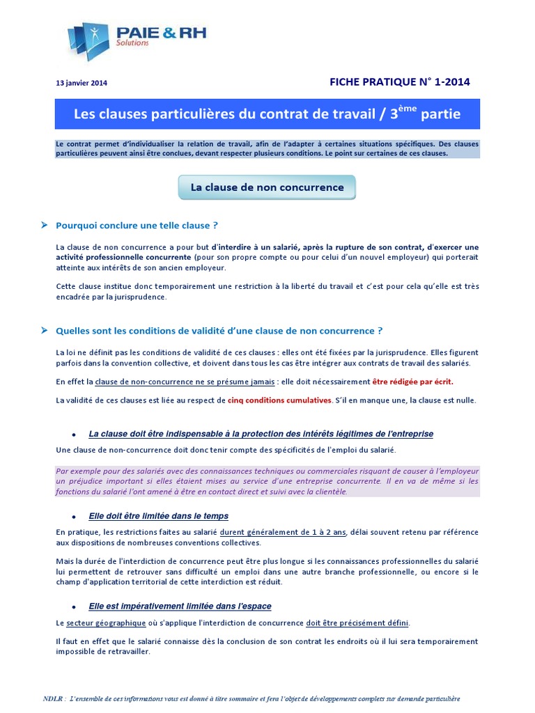 Clause de non concurrence jurisprudence. Négociatrice immobilier dentreprise et revente département syndic appartenant à la société nexity lamy a été licenciée par lettre recommandée datée du 5 janvier 2009 dans laquelle lemployeur renonçait au bénéfice de la clause de non concurrence. Pour quelle soit applicable la clause de. Clause de non concurrence compte tenu des responsabilités et des fonctions assurées par mmem à compléter soit à compléter en précisant les responsabilités attribuées qui doivent être identiques à celles indiquées sur le contrat initial et afin de préserver les intérêts de la société en cas de rupture du contrat de travail pour quelque motif que ce soit. Le but principal de cette clause est de protéger les intérêts de lemployeur en empêchant les employés daller travailler pour un concurrent. Si le paiement de cette indemnité de non concurrence a déjà eu lieu lors de la rupture du contrat de travail le plus souvent lemployeur peut demander le remboursement de cette indemnité. Jurisprudence clause de non concurrence.