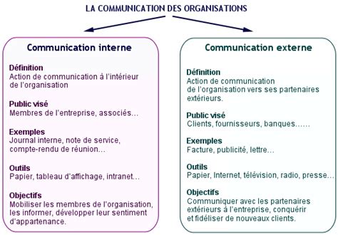 Communication interne et externe. Communication interne et communication externe sont deux spécialités différentes répondant à des objectifs différents et sadressant des cibles différentes. Concernant la communication externe celle ci introduit dans le processus des tiers ne faisant pas partie de lentreprise. Si le public visé fait partie de lenvironnement de lorganisation fournisseurs clients etat institutions financières ou non financières et autres partenaires il sagira dune communication externe. Les principales techniques ou voies de la communication externe sont. Les deux formes de communication sont fortement imbriquées. Pour leurs objectifs caractéristiques et participants parmi de nombreux autres facteurs il est clair que les deux types de communication sont différents.