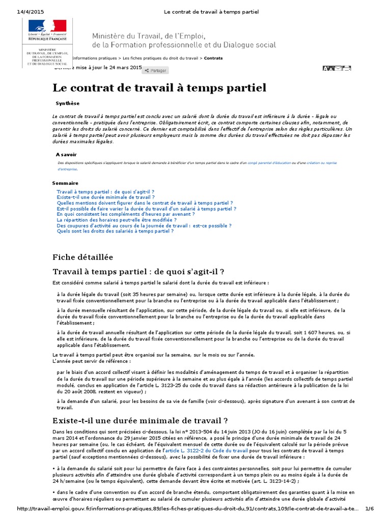 On peut ainsi distinguer le contrat de travail à temps plein du contrat de travail conclu pour un travail à temps partiel. 3123 6 durée minimale de travail et heures complémentaires art. A la différence du cdi à temps plein le code du travail stipule que le contrat de travail est dans le cadre dune activité à temps partiel obligatoirement conclu par écrit. Le salarié qui a signé son contrat de travail à temps partiel avant le 1 er juillet 2014 cdi ou cdd nest pas tenu de respecter une durée minimale de travail. Code du travail. 3123 5 contrat de travail art.