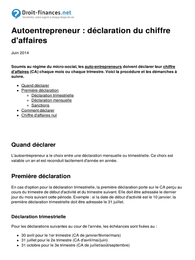 D claration trimestrielle de chiffre d affaires. En principe le micro entrepreneur ou lautoentrepreneur doit déclarer son chiffre daffaire tous les mois. Si vous neffectuez pas votre déclaration mensuelle ou trimestrielle vous serez redevable dune pénalité de 50 pour chaque déclaration manquante et ce même si votre chiffre daffaires est nul. Il faudra compléter ce formulaire avec votre nom et adresse partie blanche en haut. Quand il sagit dune création dentreprise la demande de déclaration trimestrielle est formulée auprès du cfe centre de formalités des entreprises et. Un délai minimum de 90 jours doit sécouler entre la date de début dactivité et la première déclaration et varie selon le choix de la périodicité de vos déclarations. Que se passe t il en cas dabsence de déclaration de chiffre daffaires.