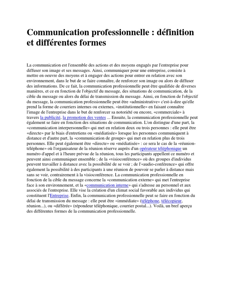 La communication est laction de communiquer de transmettre des informations ou des connaissances à quelquun ou sil y a échange de les mettre en commun ex. Communication de la chaleur à un corps. à partir de ces éléments communs ébaucher une définition qui fasse la synthèse de ces différentes propositions cest à dire qui se réduise à un nombre minimal déléments indispensables et qui soit la plus générale possible. La communication est un mot dérivé du terme latin communicare qui signifie partager participer rendre commun. Le résultat de cette action cf. Questions de travail ces définitions ne se recoupent pas entièrement.