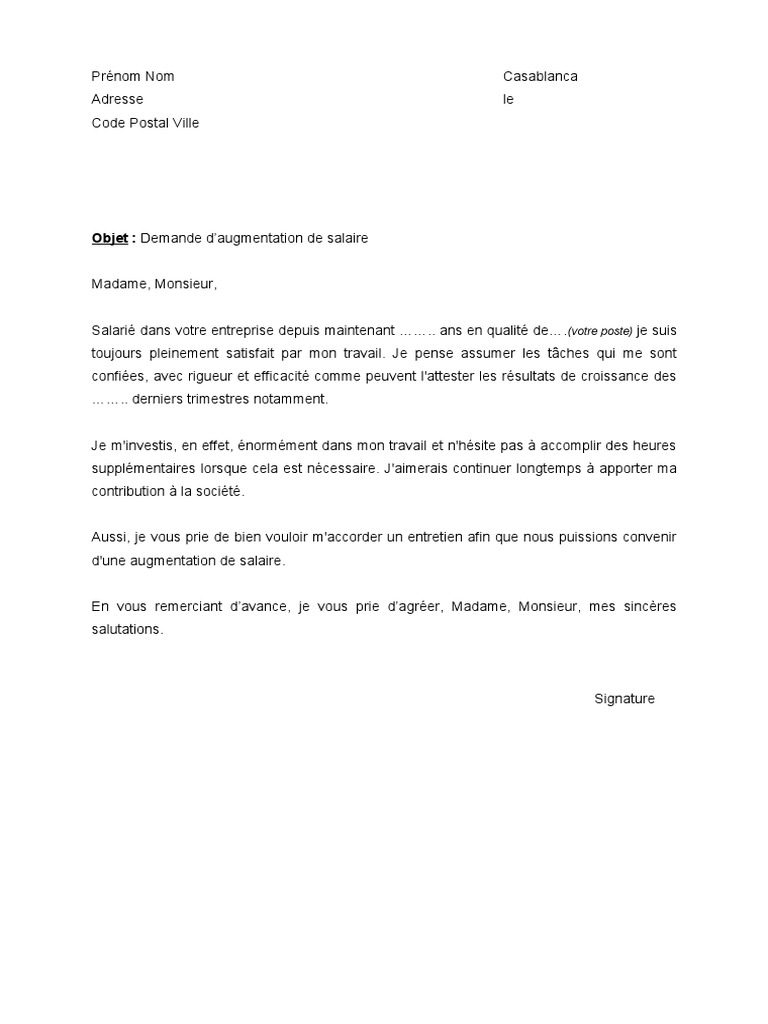 Modèle de lettre publié le 19 décembre 2010 dernière mise à jour le 29 septembre 2017. Demande daugmentation de salaire.