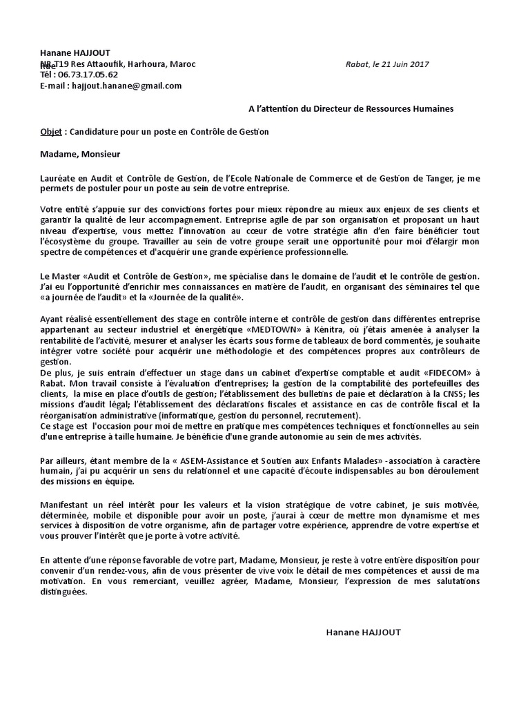 Un exemple à ne pas reproduire de lettre de motivation pour un stage audit conseil. Madame monsieur actuellement en dernière année de licence de sciences de gestion à luniversité de nom de la ville je vous propose ma candidature pour le master contrôle de gestion et audit organisationnel. Le diplôme supérieur de comptabilité et de gestion ainsi quun master en management comptabilité finance ou audit et contrôle de gestion vous permettront également de vous démarquer des autres candidats. Lettre de motivation confirmé lettre de motivation candidature spontanée lettre de motivation comptabilité gestion audit lettre de motivation finance comptabilité achats analyste financierière. Lettre de motivation. Lettre de motivation tous nos modèles gratuits.