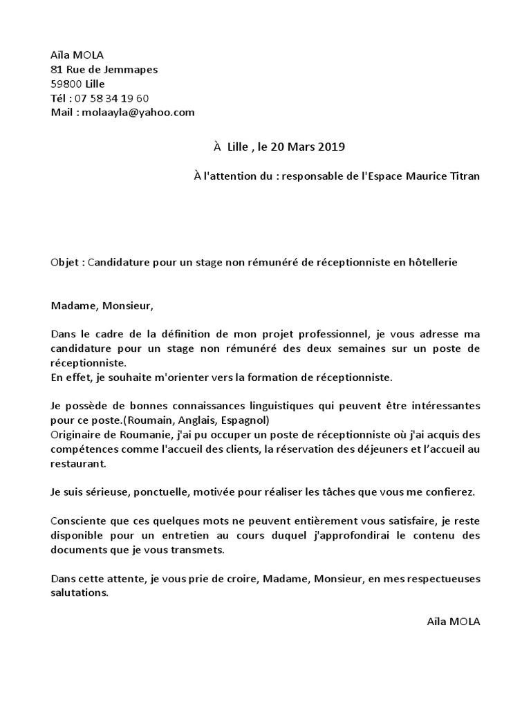 Ensuite il faut le modifier et ajouter votre touche personnelle pour faire la différence par rapport aux autres candidats. Madame monsieur je suis actuellement à la recherche dun emploi ou précisez votre activité actuelle dans indiquez létablissement lentreprise après lobtention de énumérez vos diplômes obtenus. Accueillir et enregistrer les clients.