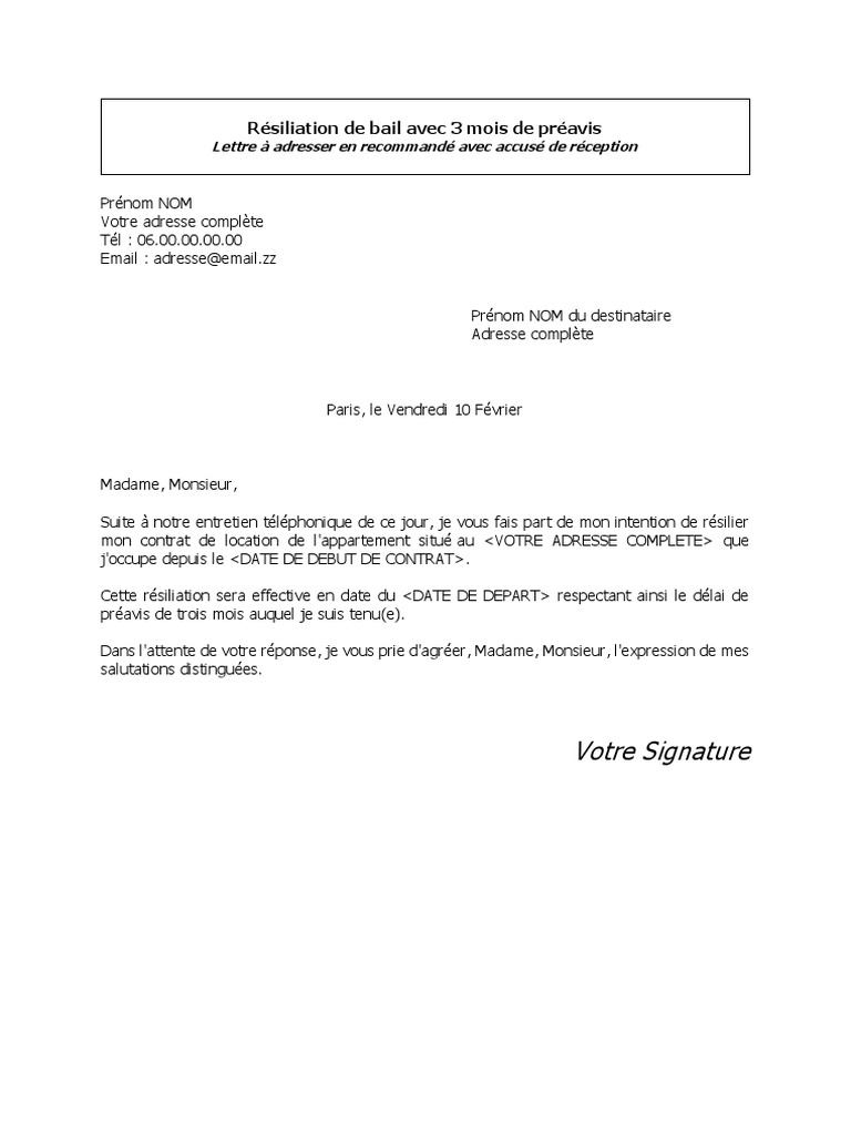 En tant que locataire vous pouvez résilier votre bail à tout moment mais vous devrez respecter le préavis de 3 mois à compter. La lettre de résiliation du bail de location est une formalité indispensable pour donner congé à lautre partie lors de lexécution dun bail de locationcette obligation est consacrée par la loi du 6 juillet 1989 tendant à améliorer les rapports locatifs et par la loi alur de mars 2014la lettre de résiliation du bail doit contenir des informations substantielles telles que. Vous êtes locataire et devez quitter rapidement votre logement. Lettre type de démission avec formule de politesse en zone tendue ou non avec préavis d1 mois ou de 3 mois. Lorsque vous déménagez vous devez conformément à larticle 15 de la loi 89 462 du 6 juillet 1989 respecter un délai de préavis vis à vis du bailleur et lui envoyer une lettre de résiliation du bail par lettre recommandée avec avis de réception pour lui informer de la date de votre départ du logement. Dans de nombreux cas une lettre de résiliation est nécessaire pour interrompre des contrats commerciaux.