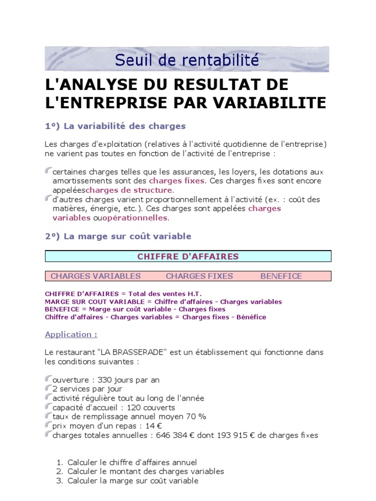 Dans le détail elle correspond à la différence entre le chiffre daffaires annuel les achats incorporés aux ventes les services extérieurs quelques. Mscv ca tx mscv 75 125 06 soit 60 seuil de rentabilité. Compte tenu de la marge sur coût variable un responsable peut facilement calculer le seuil de rentabilité et le chiffre daffaires ciblé et prendre de meilleures décisions concernant lajout ou la suppression dune ligne de produits. Ca cv mscv 125 50 75 euros taux de marge sur coût variable.