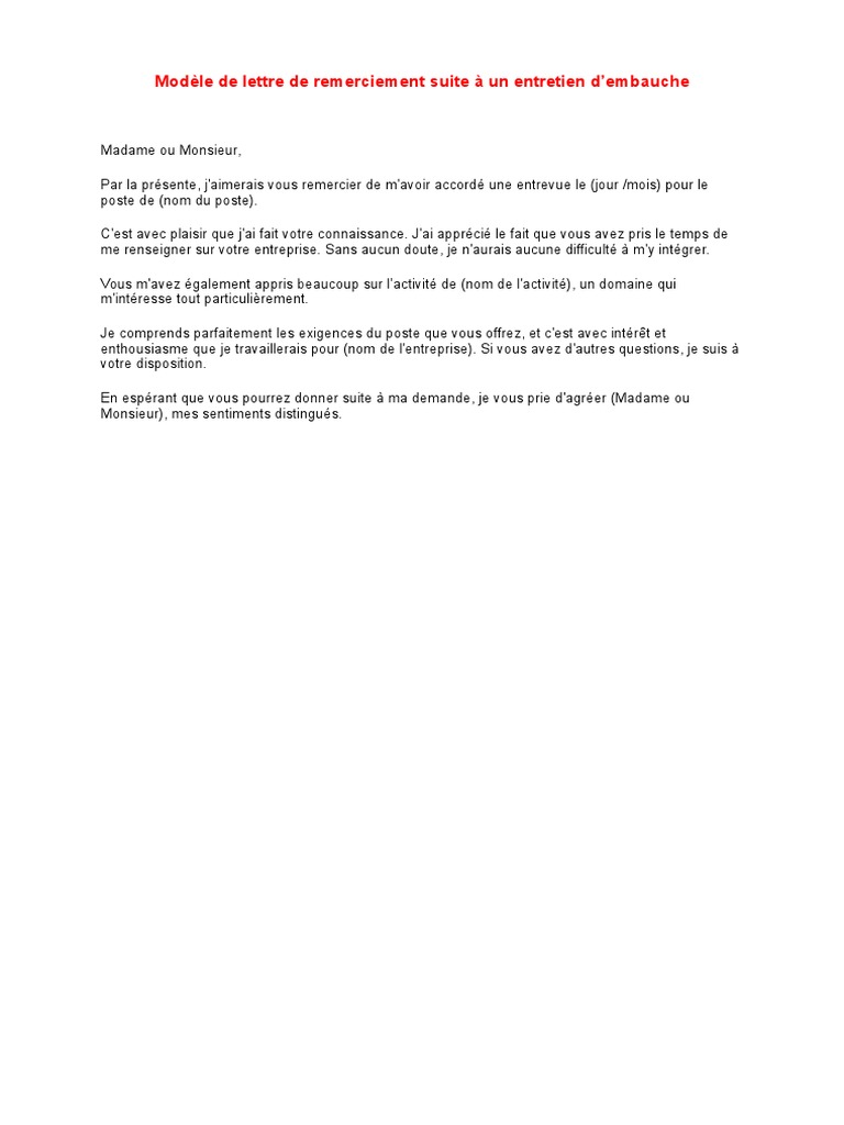 Remerciements entretien de recrutement. Bien entendu le texte ci dessous est uniquement indicatif.