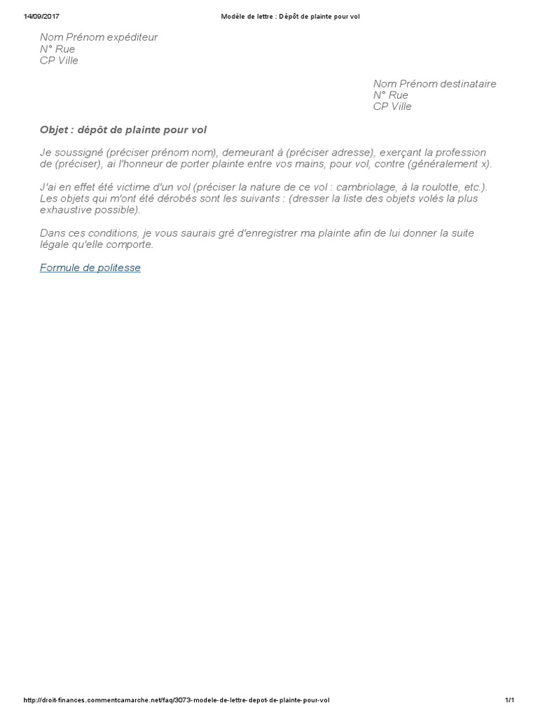 Pour transformer votre modèle de lettre plainte pour vol en pdf utilisez le logiciel de traitement de texte gratuit libreoffice ou openoffice qui permet de faire directement la conversion de word à pdf. Dépôt de plainte pour vol je soussigné préciser prénom nom demeurant à préciser adresse exerçant la profession de préciser ai lhonneur de porter plainte entre vos mains pour vol contre généralement x. Pour quelle soit enregistrée comme une plainte vous devrez signer cette déclaration dans une unité de gendarmerie ou un service de police que vous allez choisir. Si vous portez plainte au delà de ce délai les autorités ny donneront pas suite. Après la pré. Mode demploi pour savoir comment porter plainte en ligne sur internet.