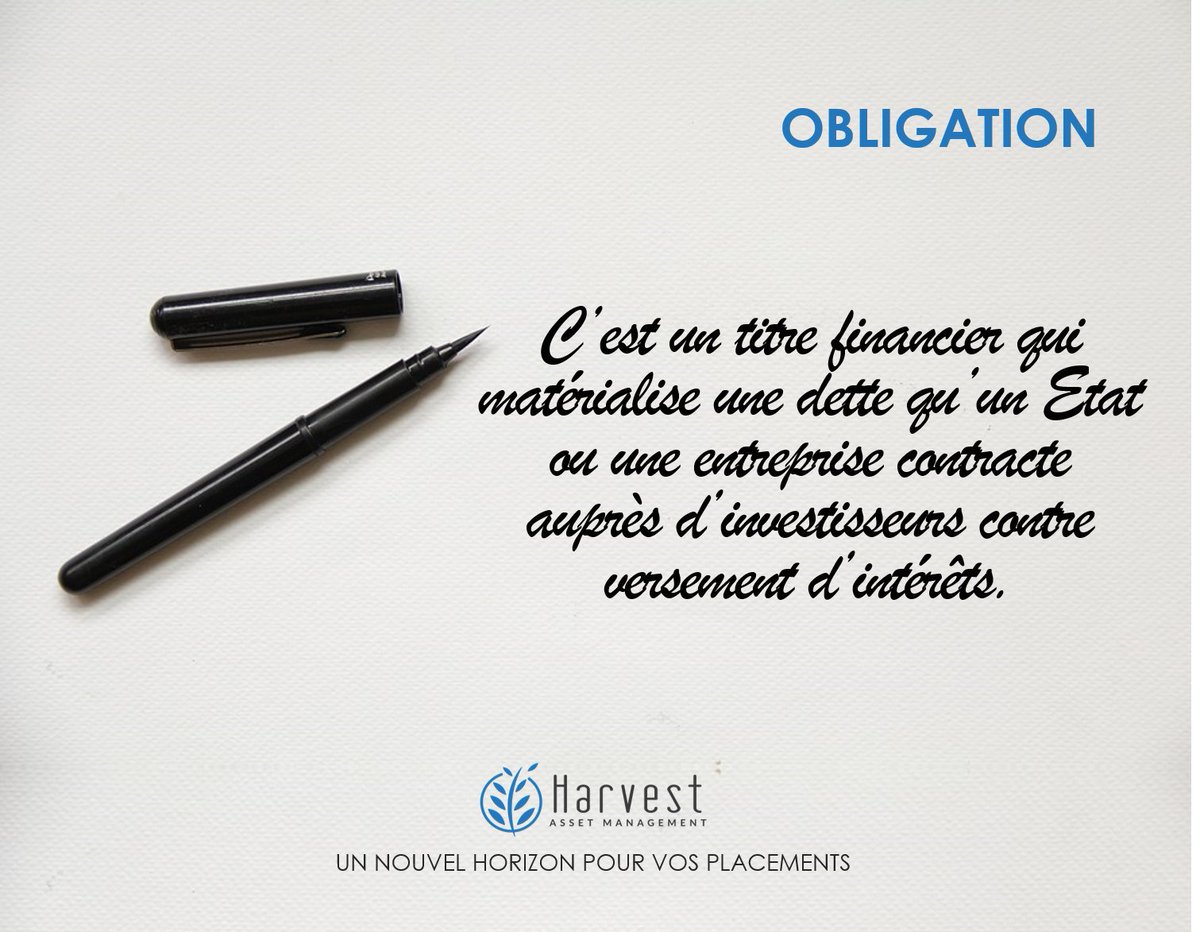 2 min 30 s. Une obligation est un morceau de dette émis par une entreprise une collectivité territoriale ou un état. Dans la vidéo daujourdhui nous allons découvrir ce quest une obligation. Contrairement à une action une obligation nest pas une part du capital social dune de la société émettrice mais un titre de créance donnant droit au versement dintérêts. Ce concept est étudié dans des domaines comme la philosophie léthique et la psychologie où les gens sont intéressés par les origines du comportement humain et les racines du processus décisionnel. De façon simple une obligation est une partie dun emprunt.
