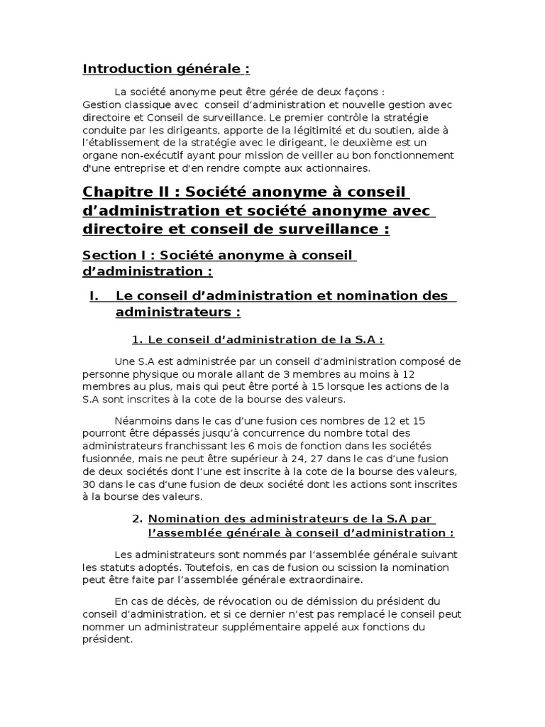 Sa conseil d administration. Le conseil dadministration nomme un directeur général de la société anonyme qui peut être le président un administrateur ou un tiers. Le conseil dadministration est un groupe de personnes chargé de définir la stratégie globale dune entreprise et de veiller à sa bonne application. Le conseil dadministration dune société anonyme est composé de 3 à 18 membres élus par lassemblée des actionnaires. Une fois mis en place le conseil dadministration peut nommer un directeur général de la société. Le conseil dadministration dune sa est constitué de 3 à 18 membres un chiffre pouvant être exceptionnellement porté à 24 en cas dopération de fusion et pour une durée maximale de trois années. Le conseil dadministration le président du conseil dadministration et le directeur généralla loi nre du 15 mai 2001 offre désormais la possibilité de dissocier les fonctions de président et de directeur général.