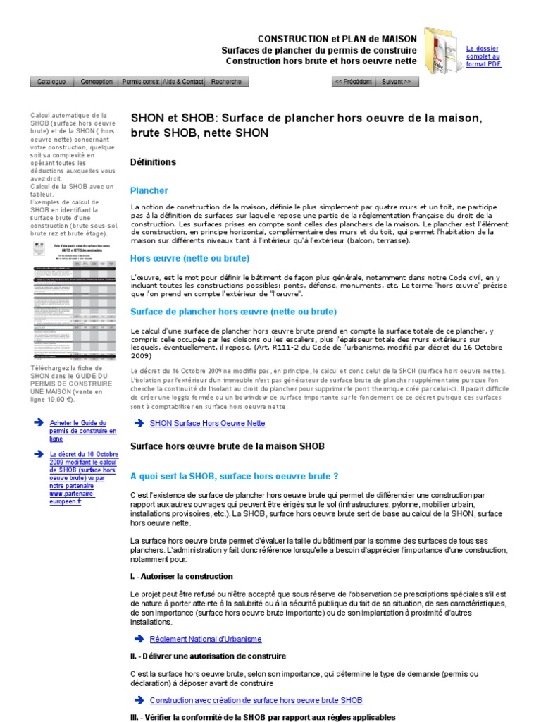 Surface de plancher d une construction. La surface de plancher est devenue depuis le 1er mars 2012 la référence en matière dautorisation durbanismeelle remplace les surfaces shon et shob et permet avec lemprise au sol de connaître le type de dossier dautorisation à réaliser lors dun projet de construction ou de travaux sur un bâtiment existant. En effet la sdp ou sp sert à déterminer le type dautorisation durbanisme nécessaire lobligation de recours à un architecte et à appliquer les plans locaux durbanisme. Il nest plus question de surfaces shon et shob. La surface de plancher se calcule à partir de critères précis selon quil sagit dune maison ou dun immeuble collectif. Les surfaces prises en compte dans la surface de plancher. Somme des surfaces de plancher closes et couvertes sous une hauteur de plafond supérieure à 180 mètre calculée à partir du nu intérieur des façades du bâtiment déduction faite des vides et des trémies.