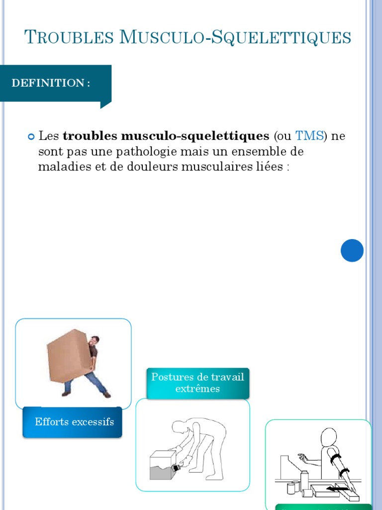 La définition des troubles musculo squelettiques lexpression troubles musculo squelettiques tms regroupe ou un ensemble de maladies localisées au niveau ou autour des articulations. Publications relatives aux latr de linstitut de recherche en santé et en sécurité du travail irsst. 11 troubles musculo squelettiques associés au travail définition lexpression troubles musculo squelettiques correspond à des atteintes de lappareil locomoteur cest à dire des muscles des tendons du squelette des cartilages des ligaments et des nerfs. Connaissez vous les troubles musculo squelettiques aussi appelé tms. Les troubles musculo squelettiques. Les troubles musculo squelettiques regroupent lensemble des pathologies qui touchent les tissus mous situés à proximité des articulationsleur survenue est due à un déséquilibre entre les capacités physiques dune personne et la réalisation de tâches répétées dans le cadre du travail.