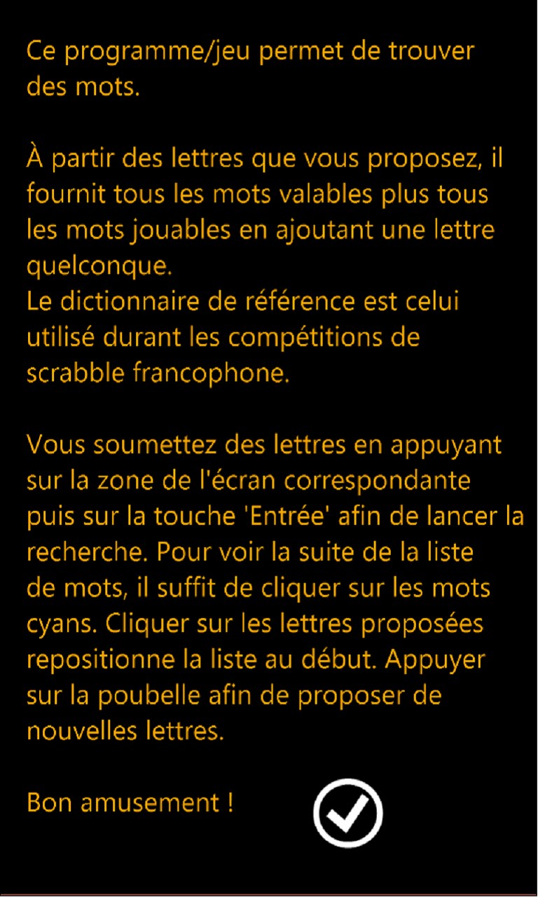Par mot exemple. Il faut juste introduire les lettres que vous avez appuyer le bouton chercher pour former des mots avec des lettres ordonnés par nombre de lettre.
